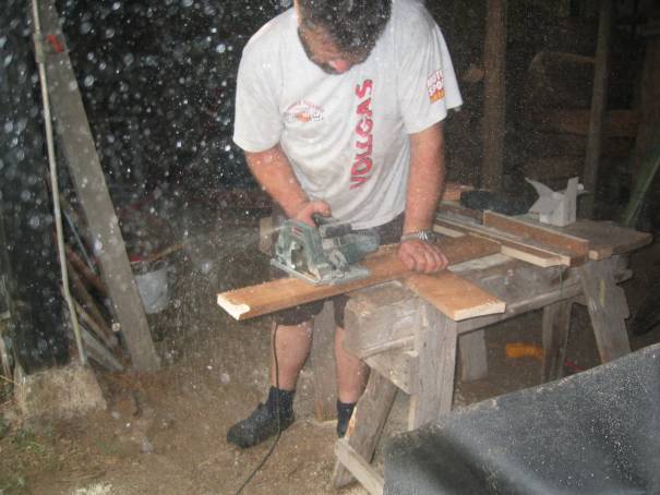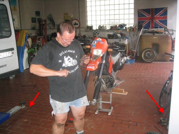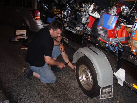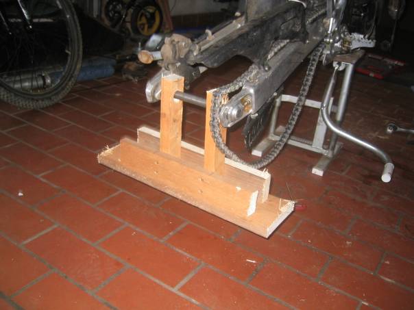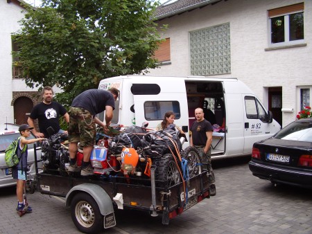 Shorty ist heute noch mit seiner Tochter im Urlaub in Spanien. Der Rest der Truppe ist seit 17Uhr fleißig damit beschäftigt, die 4 Mopeds auseinander zu bauen, um diese auf dem Anhänger zu verstauen. Damit die Mopeds ohne Räder dennoch wackelfrei auf dem Hänger stehen, entwickelte Holzwurm Rappel 1A Böcke fürs Hinterrad