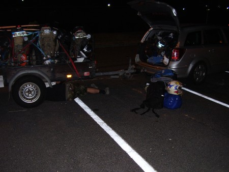 Das Reisegespann ist bisher ohne Pause unterwegs. Um 2 Uhr nachts vernehmen wir Schleifgeräusche, der Diesel kämpft zudem gegen eine unerklärliche Bremseinwirkung an. Es folgt ein Boxenstopp auf einem Rastplatz mitten in Ungarn. Die Reparatur von klemmender Auflaufbremse des Hängers wirft uns 2 Stunden im Zeitplan zurück. LKW-Schlosser Rappel glänzt durch 1A Fachwissen und Schrauber Know-how.