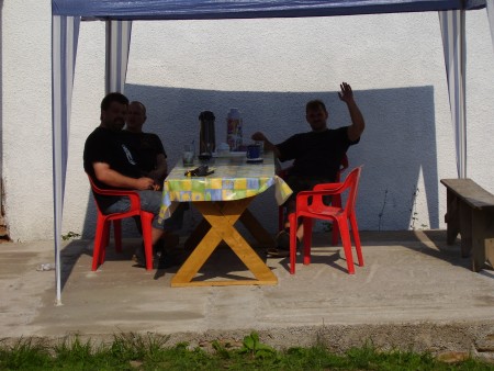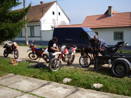 Die letzten Kilometer in Rumänien kosten uns auf Grund der katastrophalen Straßenverhältnisse sehr viel Zeit. Dennoch erreichen wir unsere Pension in Weidental planmäßig innerhalb von 23 Stunden. Mopeds schnell abgeladen und zusammengebaut, lecker Geschloter-Suppe (keiner weiß was es war) mit Zucchini-Pfannekuchen, gefolgt von Spaghetti auf Hackfleischsoße eingefahren. Nachtisch: Kirsch-Sahne-Rolle. „Wenn uns unsere Pensions-Köchin weiterhin so bewirtet, ist auch Essig mit Abnehmen, Männer!“, stellt Rappel fest.