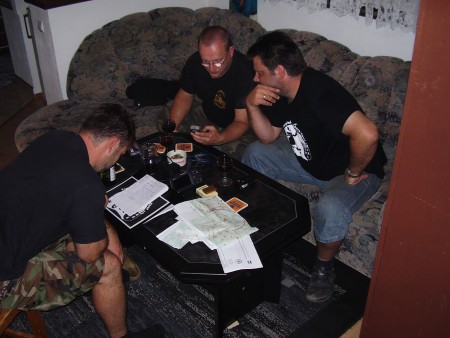 Den Vorrat an Ursus-Bier haben wir am Abend in unserem gemütlichen Wohnzimmer schnell weggepichelt. Zum Glück fand sich noch eine 2ltr. Flasche Rosu-Vartus Rotwein (original Rumänisch, nach literweise Ursus-Bier sogar trinkbar). Geistig gestärkt vertiefen wir uns im Kartenmaterial und planen die Cross-Route für den nächsten Tag: „Hauptsache quer durch eine Klamm fahren und Mopeds mit Seil über dicke Wacker ziehen!“, wird das primäre Planungsziel manifestiert.