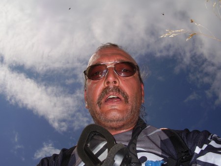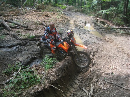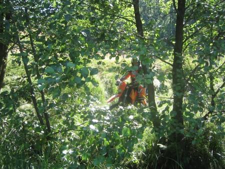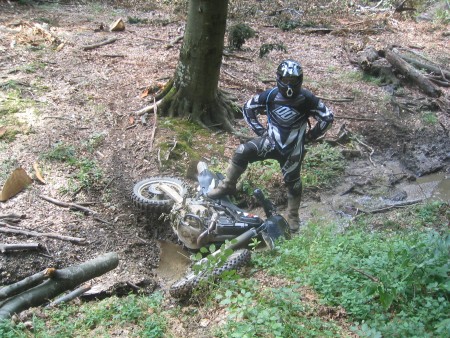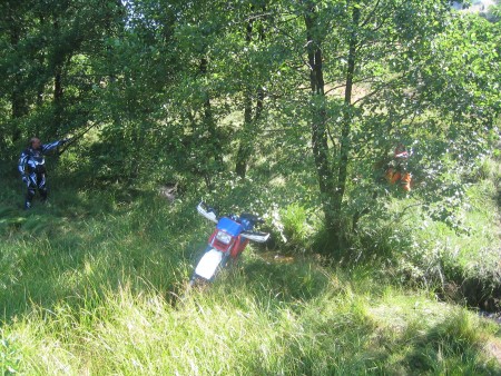 Natürlich wollen wir auch ein paar nahegelegene Kontrollpunkte abfahren. Zum Warmfahren stehen gleich zwei Bachdurchfahrten auf dem Programm gefolgt von einer heiklen Bergsteiger-Etappe: Es gilt einen steil ansteigenden Hang hinauf zu fahren, etwa 6 Meter in die Höhe. Der Hang ist nicht komplett einzusehen, da die Äste einer jungen Kiefer die Sicht behindern. Somit erkennen wir zu spät, dass der letzte Meter der Auffahrt einen 90° steilen Absatz hat. Rogers DR macht ordentlich „Männchen“ am Absatz und Shorty wollte mit der XR die Kiefer fällen. Havoc´s Kati fraß sich am Hang fest. Dieser Hang kostete uns inklusive Bergung der XR und nachfolgender Andappel-Orgie gut 20 Minuten.