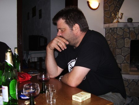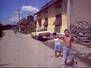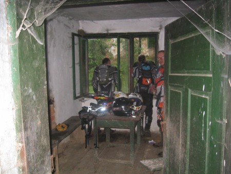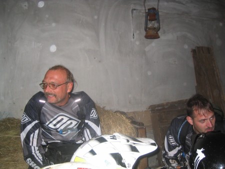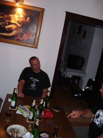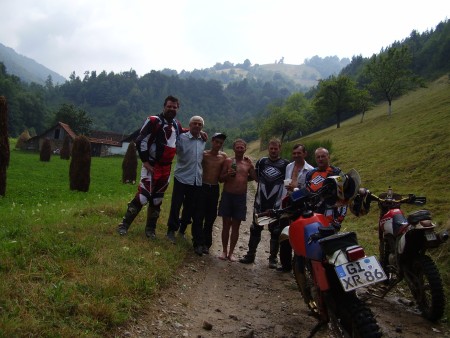 Als der Regen abflaut verwandelt sich der Weg durchs Dorf in einen Bach. Wie auf Wellen surfen wir den Weg bergab. Unten angekommen landen wir mitten in einer feuchtfröhlichen Rumänengesellschaft (Bergbauern). Um die Gastfreundschaftlichkeit der Rumänen nicht zu kränken, saufen wir mit Ihnen ein paar selbstgebrannte Schnäpse aus alter 1,5ltr. PE-Flasche. Hierbei glänzt unser Karpaten-Shorty durch 100% Integration und ist von der Gastfreundschaftlichkeit der Rumänen mehrfach angetan: „Ist durchaus trinkbar, Männer!“.