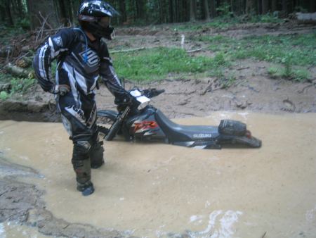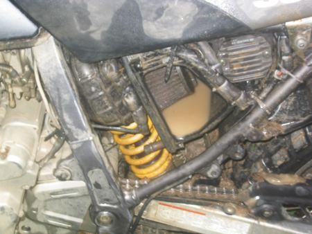 Nachdem wir wieder Fahrt aufgenommen haben, beginnt das Wasser im Motoröl zu verdampfen und zwängt sich rückwärts durch den Vergaser in den Luftfilter um dort zu kondensieren und teils wieder angesaugt zu werden. Wir öffnen bei laufenden Motor den Luftfilterkasten und drinnen sieht es aus wie in einem Dampfbad. Die Motorleistung verringert sich dementsprechend auf gefühlte 5PS. Nun musst eine intelligente Entscheidung getroffen werden, um einen möglichen Motorschaden zu verhindern. Rappel bestimmte dann in der Karte den kürzesten Weg zu einer Tankstelle, um dort Service-Arbeiten an der DR vornehmen zu können. Roger sieht schon die Verkaufs-Anzeige im kommenden Herbst vor sich: „DR650. Ölwechsel öfter gemacht wie vorgeschrieben, kaum Unfall, wenig Gelände. Preis VB“.