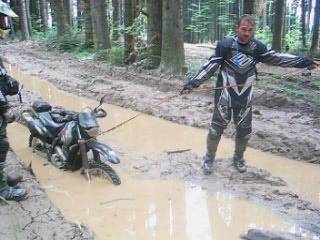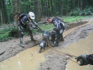 Nun heißt es anblasen bis die Nippon-Titanic wieder auftaucht. Beim Drücken auf den Anlasser merken wir schnell, dass Wasser sich weder komprimieren noch zünden lässt. Also Zündkerzen ausbauen und die DR wie ein Wal abblasen lassen. Dann noch aufs Hinterrad stellen, damit die Bilch aus dem Auspuff läuft. Danach pröttelt die DR wieder lustig vor sich hin – zwar wie ein Lanz mit ordentlich Fehlzündung aber sie gibt sich größte Mühe!