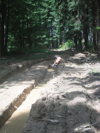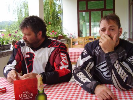 Wir treffen hier drei Enduristen, die zwar nicht die EnduRomania fahren aber dennoch Spaß haben. Kurz werden Erfahrungen übers Rumänische Gelände ausgetauscht. Die zwei Jungs und das eine Mädel fahren hervorragendes und leichtes Gerät: KTM 300, Gas-Gas 250, und KTM 400. Komischerweise sind die Dinger blitzsauber, obwohl die drei gerade ihre Crossklamotten ausziehen – also kommen die doch gerade aus dem Gelände. Da stellt sich einem die Frage wo die rumfahren? Unsere Böcke sind jedenfalls so verdreckt, dass sich gerade noch so die Räder drehen.