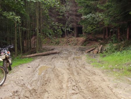 Erster Kontrollpunkt ist ein Unterstand mitten im Wald. Der Weg ist so breitgefahren und vermatscht, dass man die Mopeds nicht auf dem Seitenständer abstellen kann.