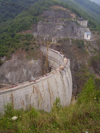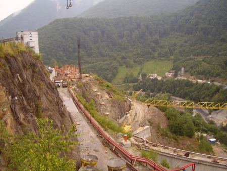 Dieser wird irgendwann mal den Fluss Rece auf über 5km Länge aufstauen und ein Wasserkraftwerk betreiben. Wir machen halt und bestaunen die Bauarbeiten. Interessant sind vor allem die Bautechniken und Baumaschinen die im Einsatz sind. Es ist sogar extra ein großes Betonwerk daneben gebaut. Vom linken zum rechten „Ufer“ ist ein Seil-Kran gebaut. Der transportiert mit einem Klappbehälter den Beton vom Betonwerk zum Damm – sehr spektakuläre Angelegenheit.